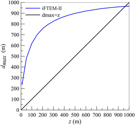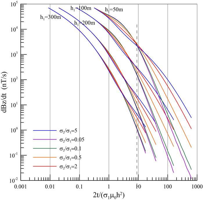 Secondly, the maximum detection depth of the system can be determined by using the system’s value. For a multi-layer medium model, it can be equivalently regarded as a two-layer medium model, as long as the average conductivity of the multi-layer medium is used to replace the conductivity of the overlying stratum (Prince, 1949). When the abnormal response drops to the minimum identifiable signal threshold of the system, the system can just distinguish the second layer. Currently, the separation time t = t0 corresponds to the maximum detection depth dmax: