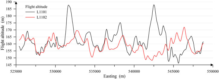 Figure 17. Record chart of repeated flight altitude. To verify the stability of the system, repeated flight measurements were conducted on the same survey line (L1101 and L1102) at different times. Since the amplitude of the observed signals in airborne geophysical exploration is closely related to the flight altitude, it is necessary to accurately record the flight altitude data, which serves as a key parameter for later data comparison analysis and altitude correction.