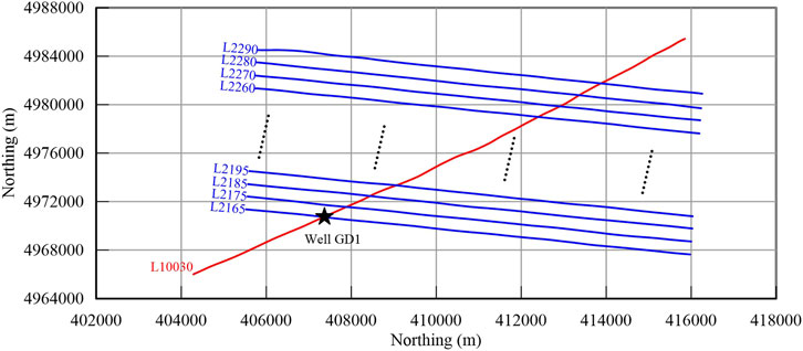 Figure 19. Distribution map of survey line trajectories in the work area. The blue line segments in the figure represent valid survey lines (the invalid data from turning sections have been excluded), and the red line segments are the cutting lines used for data verification and leveling. The five-pointed stars indicate the drilling locations. By comparing the well logging data with the electromagnetic inversion results, the accuracy of data interpretation is verified.