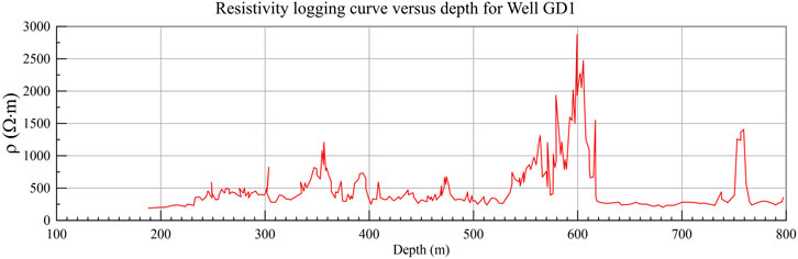 Figure 20. Resistivity logging curve versus depth for well GD1. Based on the actual drilling data, it reveals the vertical distribution characteristics of the resistivity of underground media, providing a verification basis for the results of airborne electromagnetic inversion.