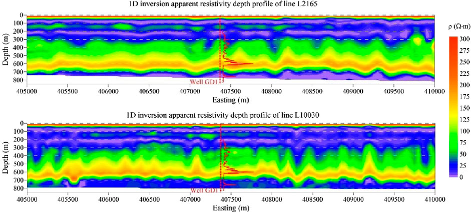 The theoretical detection depth calculated for the iFTEM-II system demonstrates its capability for deep exploration. To further validate the system’s detection performance, inversion results from survey lines L2165 and L10030, which intersect with borehole GD1, were compared with the borehole logging data.