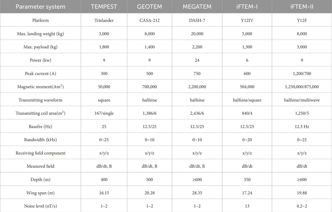 The major FTDAEM systems in the international community include TEMPEST, GEOTEM, MEGATEM, iFTEM-I, and the newly developed iFTEM-II by the team, as shown in Table 1.
