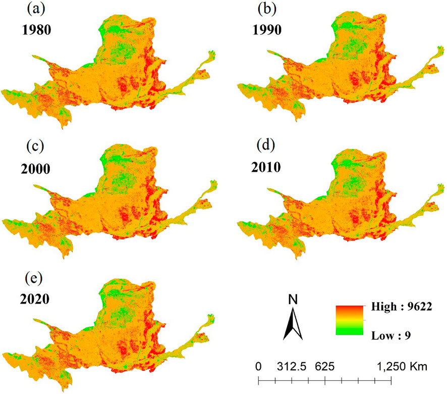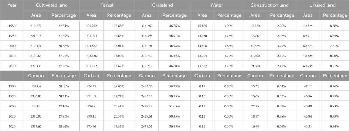 The land-use types and carbon storage within the YRB spanning years 1980–2020 were presented in Table 4. Grassland constituted the predominant land-use type in the YRB between 1980 and 2020, encompassing over 46% of total basin area. It was followed by cultivated land, forest land, unused land, construction land, and water, in descending order of coverage. The proportion of grassland declined between 1990 and 2010 but increased by 2020, primarily due to the implementation of the “Returning Farmland to Forest and Grassland” (RFFG) policy. The total area of cultivated land has experienced an increase from 219,770 km2 to 222,835 km2 between 1980 and 2020, resulting in an increase of 3,065 km2. The unused land had decreased by 1,190 km2 during the same time frame. The forest land experienced a decline by 40 km2 between 1980 and 2020. Over the course of the 40-year period from 1980 to 2020, there has been a consistent increase in construction land. Specifically, construction land has showed a significant upward trend, increasing significantly by 1,790 km2. Although Water area in the YRB constitutes a relatively small portion, and it decreased by 1,583 km2 between 1980 and 2020.