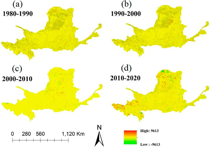 Based on the analysis of carbon storage in the YRB between 1980 and 2020 (Figure 3). In relation to the changes that occurred between 1980 and 1990, the regions experiencing alterations in carbon storage is primarily situated in the northern Hetao Plain of the YRB and Ordos Plateau. The majority of these areas exhibited an increase in carbon storage, while a few sporadic regions demonstrated a decrease in carbon storage. From period of 1990–2000, the changes in carbon storage values in the YRB exhibited a similar pattern to that of the previous decade (1980–1990). However, the areas experiencing increased carbon storage were primarily located in the northeastern region of Ordos Basin and Luo River. As depicted in Figure 3, carbon storage fluctuations in YRB during the period of 2000–2010 were minimal, with only sporadic changes observed in the central region of the basin. During the period from 2010 to 2020, significant changes had been observed in the carbon storage within the YRB. The analysis revealed there had been an increase in carbon storage primarily in the northern region of Ba Yan Ka La Mountain and the western part of the Hetao Plain. Conversely, a decrease in carbon storage had been observed in scattered areas within the northern part of the Hetao Plain and Ordos Basin. Overall, carbon storage in the northern and western parts of the YRB was highly variable, mainly in Hetao Plain and Ordos Plateau.