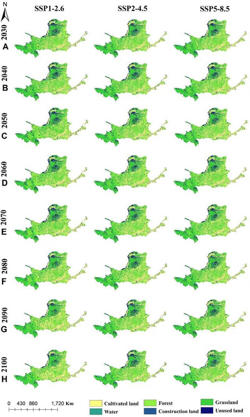 2. In the simulation results of land-use change in the YRB from 2030 to 2100 under different scenarios, the land-use types in descending order were grassland, cultivated land, forest land, unused land, construction land, and water. However, the proportional distribution of these land-use types varied significantly between scenarios.