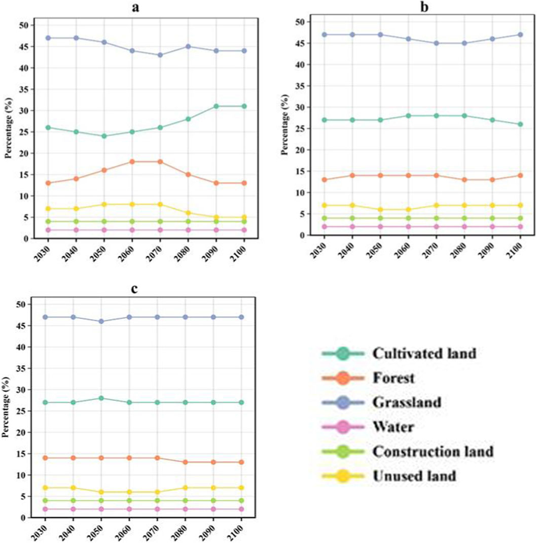 Figure 6. The proportion of different land-use types in the YRB under SSP1-2.6 (a), SSP2-4.5 (b), SSP5-8.5 (c).