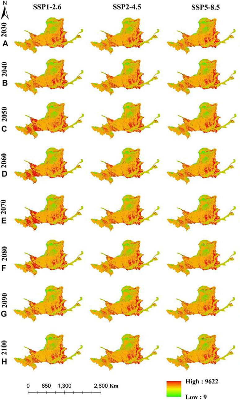 Figure 5. Land-use simulation map of the YRB in 2030 (A), 2040 (B), 2050 (C), 2060 (D), 2070 (E), 2080 (F), 2090 (G) and 2100 (H) under three scenarios.