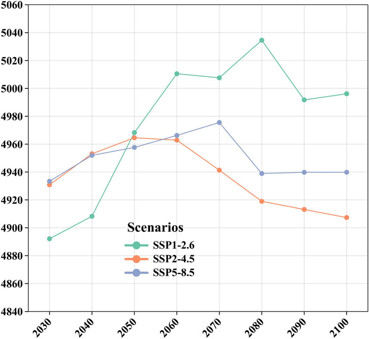 The variations in carbon storage of the YRB under various scenarios from 2030 to 2100 were shown in Figure 8. Carbon storage under SSP1-2.6 experienced a notable increase starting from 2040 and reached its peak in 2080. Among all scenarios, SSP1-2.6 exhibited the highest carbon storage levels during 2050–2100. In contrast, carbon storage under SSP2-4.5 exhibited a gradual increase from 2030 to 2060, followed by a pronounced decline from 2060 to 2080. After 2080, the decline slowed, reaching its lowest point by 2100. Similarly, under SSP5-8.5 scenario, the pattern of carbon storage fluctuations in the YRB aligned with that observed under SSP2-4.5. Specifically, there was a gradual rise in carbon storage from 2030 to 2070, followed by a sharp decline from 2070 to 2080, and a subsequent gradual increase at a slower pace.