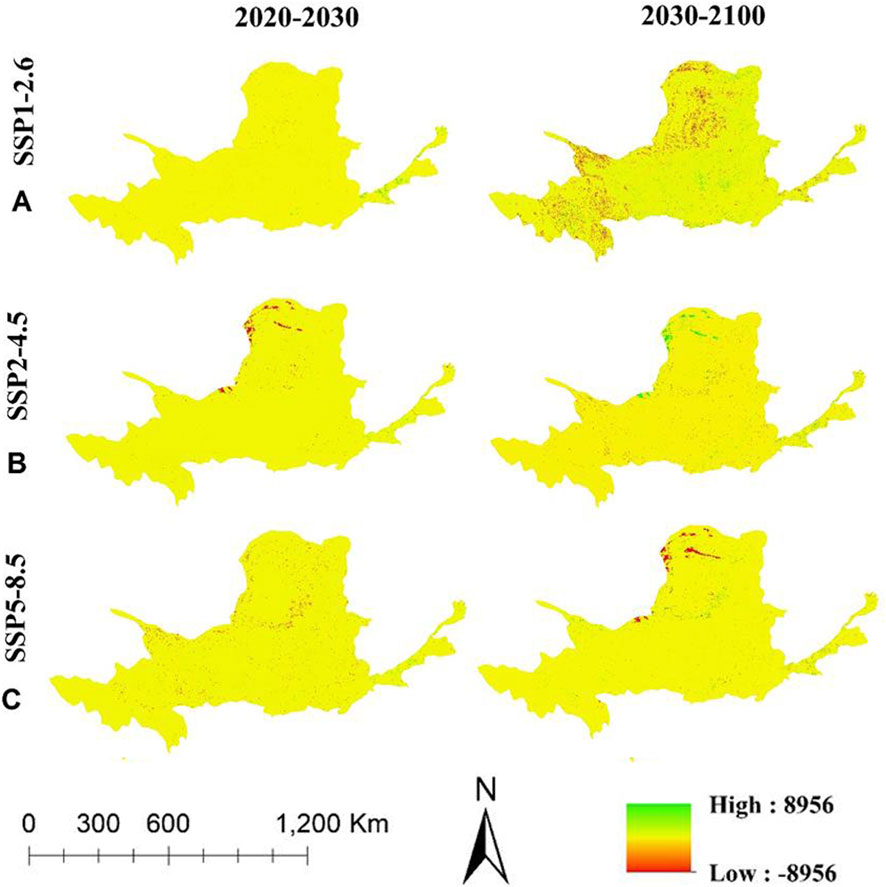 Figure 9. Variations in carbon storage of YR from 2020–2030 and 2030–2100 under SSP1-2.6 (A), SSP2-4.5 (B), SSP5-8.5 (C).
