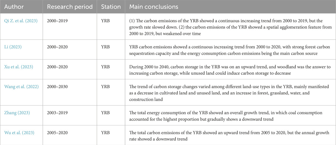 The Yellow River Basin (YRB) is ecologically significant and a pivotal region for human activities and economic development (Guo, 2022). China’s National Plan for Ecological Environmental Protection and Construction (2013–2020) formulated by the established primary tasks and objectives for advancing the YRB’s sustainability (Huang, 2019). Subsequently, the YRB Ecological Protection and High-quality Development Plan (EPHD) was officially issued for implementation from 2021 to 2025, emphasizing low-carbon development in the middle and downstream regions and requiring effective reduction of carbon emission intensity. It is evident that ecological protection and high-quality development in the YRB have become a national strategy (Li, 2023; Huo and Zhao, 2021). Consequently, extensive research has been conducted on carbon emissions and reduction in the YRB (Table 1).