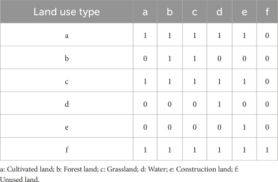 Based on initial land-use data and the contribution rate simulated in the previous step, we set the simulation parameters, including land-use demand, conversion matrix (Table 2), and neighborhood weights (0.6, 1, 1, 0.9, 1, and 0.1), then run the model. In the simulation parameters, land-use demand refers to the data of various land types for the simulated future year. The conversion matrix represents the transfer rules between different land classes, with 0 indicating land-use type cannot be converted to another, and 1 indicating conversion is allowed. The neighborhood weight parameter represents the expansion capacity, with a range of 0–1, and a value closer to 1 indicating a stronger expansion capacity for that land type.