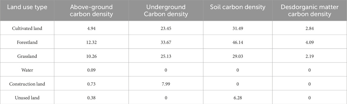 Carbon density serves as a crucial input parameter in accurately evaluating carbon storage, and it is influenced by factors like climate, soil properties, and land-use (Fu et al., 2019), necessitating the need for revision (Qi Q. et al., 2023). Carbon density values of various land-use types in the YRB, as adjusted by Yang (2021) for annual precipitation and mean annual temperature, are presented in Table 3.
