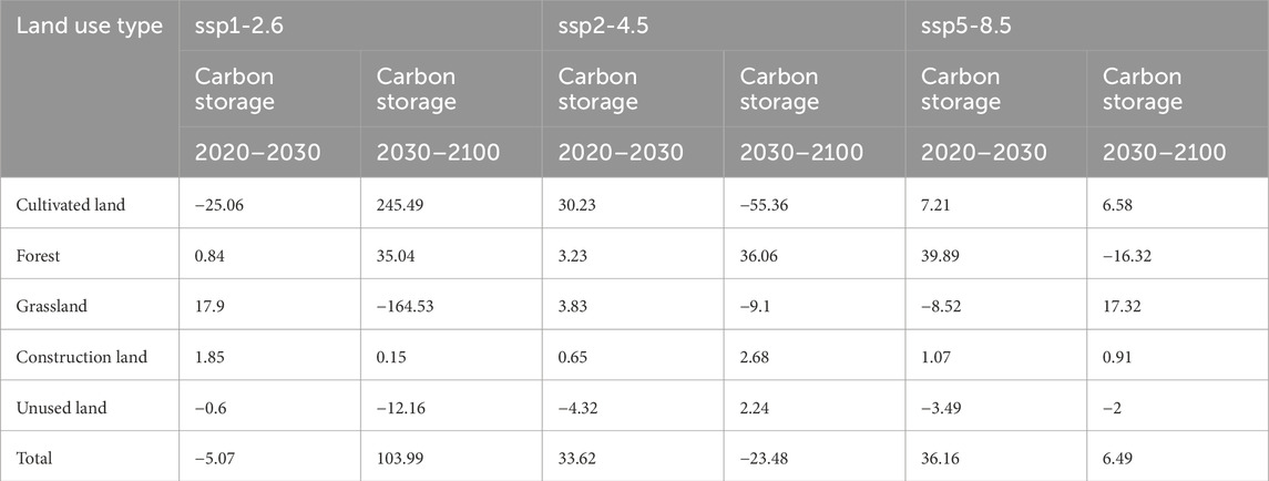 3. Carbon storage in SSP1-2.6 was projected to increase by 103.99 million tons between 2030 and 2100. Similarly, carbon storage in SSP5-8.5 was projected to increase by 6.49 million tons during the same period. In contrast, a loss of 23.48 million tons was projected under the SSP2-4.5 scenario.