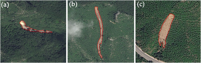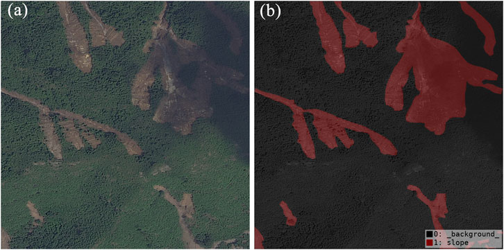 Currently, there are no publicly available high-resolution shallow landslide datasets or annotated files. Therefore, this study utilizes BJ-3 satellite data from the “23·7” heavy rainfall event in Beijing to create a shallow landslide sample database for the concentrated landslide areas in Mentougou District. Beyond selecting the study area, we employed a grid division method to partition the entire image into segments using a 1,024 × 1,024 window size and saved in 8-bit RGB format. Through the identification of morphological features, texture features, vegetation features, and other features of the optical image, the pixel-level labels are manually labeled in the labelme sample labeling software to delineate the boundary range of the landslides, which is used for the final model training. Training and labeling results are shown in Figure 3 (Liu et al., 2022; Wu et al., 2022b). The landslide dataset was divided into a training set, a validation set, and a test set, with a random split ratio of 7:1:2.