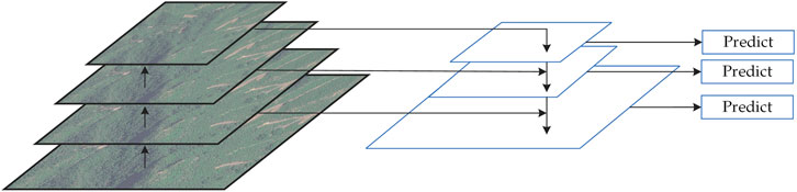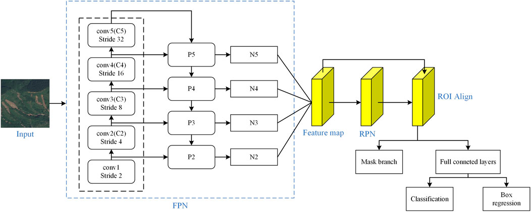 The RPN layer receives the multi-scale features provided by the FPN layer and generates candidate regions, or proposals, according to predefined rules and through model training. The parameters of the trained model are then used to select the ROIs for the model, which in this experiment corresponds to potential shallow landslide areas. The selected ROIs are fed into the alignment network to more precisely adjust their positions to match the exact extent of the target. To accurately align the ROI with the precise spatial extent of the target, bilinear interpolation is first employed to derive values at multiple sampling points within the ROI. Max pooling is then applied to these sampled values to retain the most representative features, refining the ROI boundaries to better match the target’s geometric characteristics. Subsequently, the adjusted ROI is fed into a fully convolutional network (FCN) architecture, which constructs an end-to-end learning framework through alternating convolutional and deconvolutional layers. This network performs pixel-wise classification on the refined ROI, enabling the precise identification of all pixels belonging to shallow landslide targets. This process achieves end-to-end automatic identification of shallow landslides with high positional precision (Cai et al., 2022).