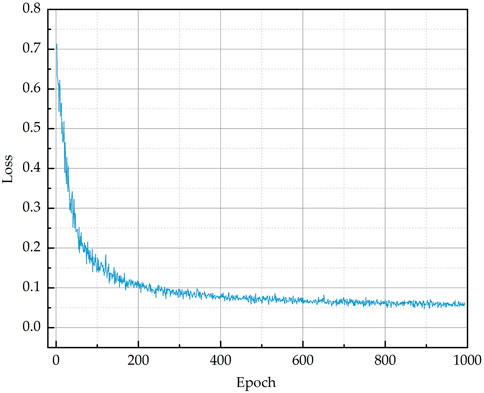 The experiment constructs a Mask R-CNN deep learning model using the PyTorch 1.14 framework and the MMdetection toolkit. The computational environment runs on a Windows 11 system equipped with a GTX 1660 6 GB GPU and an I9-12900 KS CPU, supported by 128 GB of Random Access Memory (RAM). During the model training phase, the input image resolution is set to 1,024 × 1,024 pixels, and Stochastic Gradient Descent (SGD) is utilized as the optimizer (Wu et al., 2022a; Wang L et al., 2024). To enhance the model’s learning capability, a stepwise learning rate adjustment algorithm is employed, which gradually reduces the learning rate over time. Hyperparameters are crucial for model training; specifically, the learning rate is set to 0.008, and the total number of training epochs is 1,000. The initial parameter sizes of the model are determined prior to training. Figure 6 displays the model’s training loss curve, showing a gradual convergence towards zero, which indicates a good fit between the validation set and the training outcomes. Upon completion of the training, the model’s precision can be assessed using standard evaluation metrics, including Recall and mean Average Precision (mAP) (Wang et al., 2022).