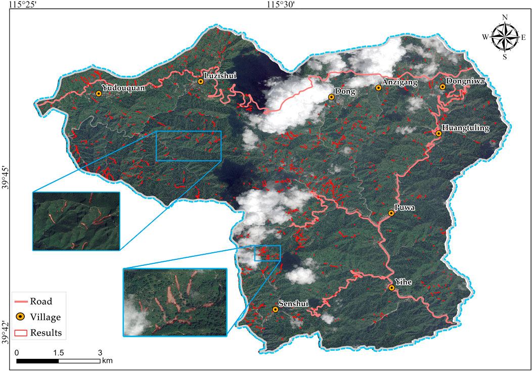 Shallow landslides are one of the most common types of natural disasters in China, usually triggered by extremely heavy rainfall, earthquakes, and so forth. On 29 July 2023, the residual circulation of super typhoon Doksuri and the combined effects of subtropical high pressure, super typhoon Khanon water vapor transport, and terrain were observed in Beijing. Extremely heavy rainstorm occurred in the western mountain area of Beijing, with the maximum rainfall intensity of 126.6 mm/h and the maximum accumulated rainfall of 1,025 mm. Due to heavy rainfall, a large-scale shallow landslide occurred in the western part of Beijing, posing a giant threat to the personal and property safety of the local people. Emergency interpretation of remote sensing data plays a critical role in emergency rescue operations, as it is essential for determining the disaster-affected area and evaluating the safety of disaster-stricken areas. However, conventional manual visual interpretation techniques impose significant limitations on disaster identification efficiency, particularly in time-sensitive emergency scenarios where rapid response is critical (Liu et al., 2024; Cheng et al., 2020; Guo et al., 2023).