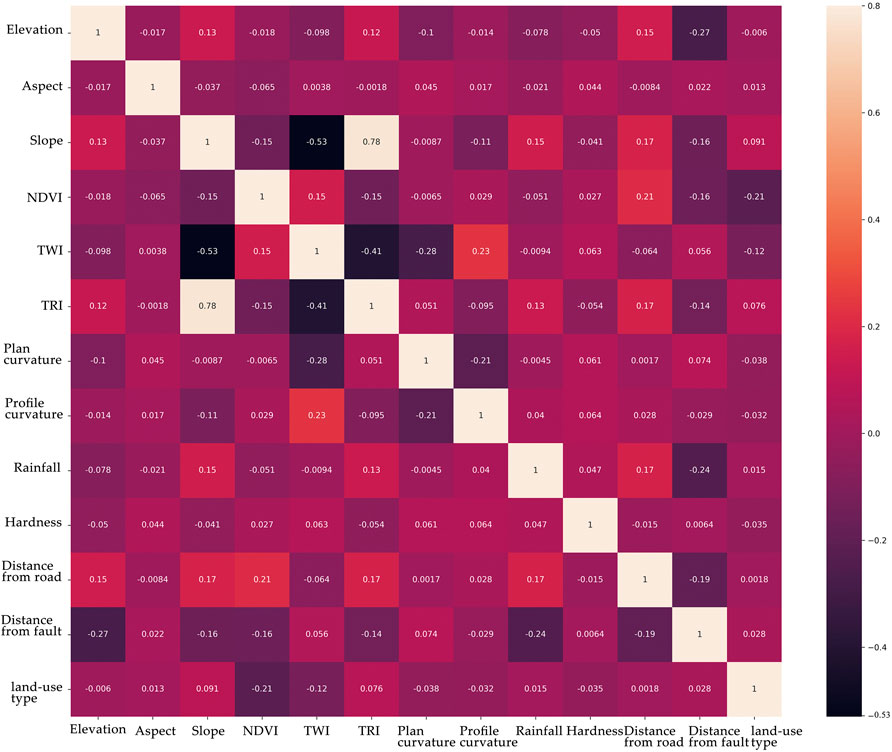 Using pearson correlation coefficient to analyze the correlation between factors (Figure 13), it was found that there is a high correlation (r = 0.72, p < 0.01) between TRI and TWI. In the I-SVM model, influencing factors are mapped into a high-dimensional feature space by means of a kernel function, and an optimal hyperplane is then identified to distinguish between landslide areas and non-landslide areas. The rationality of the model’s parameters directly depends on the independent information value of these influencing factors; strong correlation among factors undermines this foundation and increases the risk of overfitting. Therefore, in subsequent analyses, the two factor was excluded to avoid multicollinearity issues. The correlation between other factors is low (r < 0.4), indicating that they can be independently used for landslide susceptibility analysis.