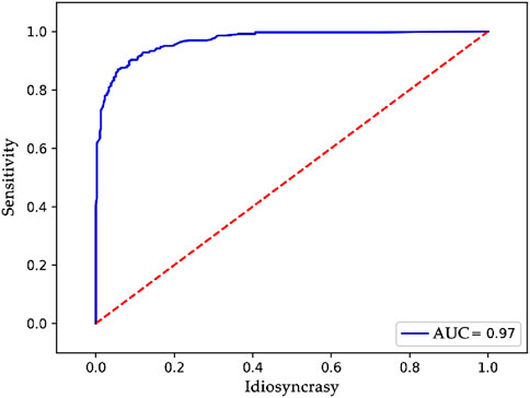The AUC metric is frequently used to measure the discriminative ability of binary classification models; therefore, it was selected as the performance evaluation metric for the I-SVM model in this study. The value range of AUC is [0.5, 1], where different values correspond to different levels of the model’s discriminative ability. The closer AUC is to 1, the better the model’s classification performance; when AUC equals 0.5, the model’s classification performance is the lowest, with no practical application value. In this study, the Wilcoxon-Mann-Whitney statistical method was employed to calculate the AUC metric, and the formula is as following Equation 12: