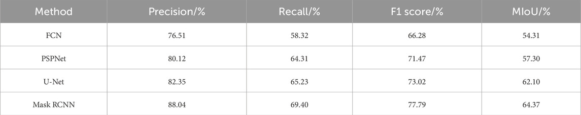 Table 1 shows the performance comparison of Mask R-CNN model with several other commonly used deep learning models on the same dataset. Results show that Mask R-CNN performs best in terms of precision, recall rate, and F1 score, especially having obvious advantages in small-scale landslide identification. Compared with U-Net, PSPNet, and FCN, the mIoU of Mask R-CNN is 2.17%, 7.07%, and 10.06% higher respectively, indicating its superiority in boundary positioning and detail capture.