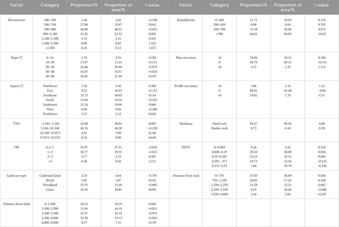 The method of reclassifying the factors was used to calculate the information content of each factor in different classification situations using the information content method (Dai et al., 2017), as shown in Figure 11; Table 2. By analyzing 13 potential landslide influencing factors through the information value model (Table 2), the information values of each factor were obtained, with results showing significant differences in their contribution to landslide occurrence: among topographic factors, the slope >40° has an information value of 0.239, indicating that steep slopes are conducive to landslide occurrence; elevation at 1,300–1,500 m and >1,500 m has information values of 1.553 and 1.872 respectively, suggesting higher landslide risk in high-altitude areas; plan curvature >0 has an information value of 1.113, meaning concave slopes are more prone to landslides; and profile curvature <0 has an information value of 1.21, indicating that convex terrain promotes landslides; for meteorological factors, rainfall in the 200–450 mm range has the highest information value of 0.703 among all factors, showing a high correlation with landslide occurrence, while rainfall >700 mm has an information value of −0.047, implying that extremely high-intensity rainfall may lead to different disaster types (such as mudslide); regarding vegetation factors, NDVI in the 0 to 0.069 range has an information value of 0.410, indicating that areas with low vegetation coverage are more prone to landslides, and as NDVI increases, the information value gradually decreases, with NDVI >0.373 having an information value of −0.340, showing that dense vegetation inhibits landslides; in terms of geological factors, the distance from faults within 0–1,500 m has an information value of 0.068, indicating slightly higher landslide risk in areas near faults, and relatively hard rock lithology has an information value of 0.50, meaning areas covered with relatively hard rock are more prone to landslides; for human activity factors, the distance from roads within 0–750 m has an information value of 0.004, indicating that areas near roads have slightly higher landslide risk, though the impact is not significant.