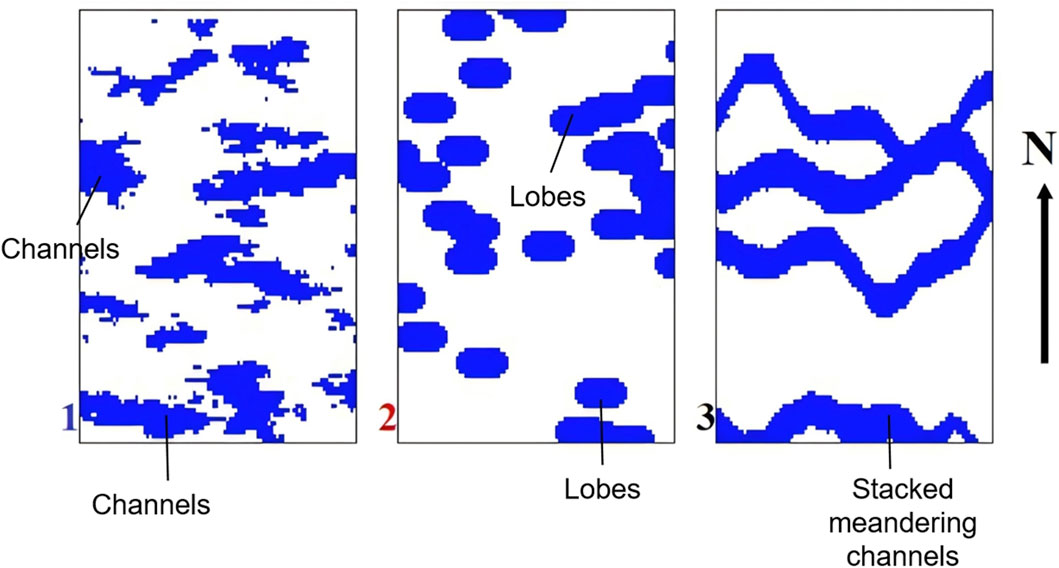 The shortcomings of these methods—specifically, the physical oversimplification of convolution methods, the statistical instability of geostatistical approaches in heterogeneous environments, and the limited interpretability and physical consistency of pure AI models—collectively highlight a critical need for a more robust framework (Baddari et al., 2009; Pi et al., 2025; Chen et al., 2023). These shortcomings include distorted sand body shapes, fragmented connectivity, and incorrect spatial relationships. Figure 2 exemplifies these issues, where the simulated sand distributions deviate significantly from expected depositional patterns, reducing their geological reliability and practical value (Zhao and Chen, 2023). An ideal solution would integrate the principled constraints of physics-based modeling with the adaptive power of artificial intelligence. In fluvial–deltaic settings, conventional post-stack or geostatistical inversions often exhibit blurred sand–shale boundaries and limited lateral continuity, especially where wavelet non-stationarity and thin interbeds prevail. Recent studies further show challenges in capturing channel–lobe transitions and realistic geometry (Harishidayat et al., 2015; Mahgoub et al., 2017; Harishidayat et al., 2024; Jacobsen et al., 2025). These limitations motivate our physics-guided, multi-wavelet fusion strategy aimed at enhancing vertical resolution and inter-well continuity.