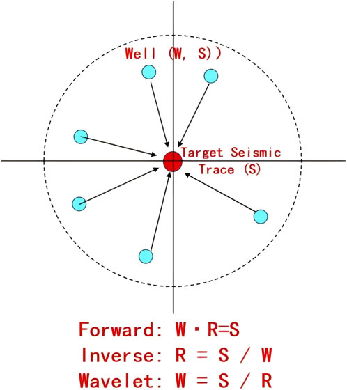 Figure 4. Schematic diagram of the convolutional physics-guided AI inversion workflow, illustrating the combination of spatially varying wavelets, multiple inversion candidates, and final AI-based fusion. The blue circle indicates the studied well and the red one in the middle represents the target seismic trace.