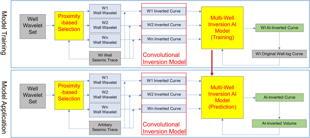 The detailed implementation is shown in Figure 5. During the model training phase, wavelets are first extracted from well data, and multi-wavelet inversion is performed on seismic traces adjacent to each well. The resulting candidate inversion curves, along with original well logs, are used to train the AI model. In the application phase, for any target trace, wavelets from surrounding wells are again used to generate multiple inversion candidates, which are fused by the trained model into a single, high-fidelity inversion output. This process is repeated across the seismic survey area to construct the final AI-assisted inversion volume (Dwivedi et al., 2021; Hui et al., 2023b).
