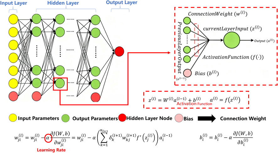 The model training process is based on the backpropagation algorithm, where weights and biases are iteratively updated to minimize the loss function