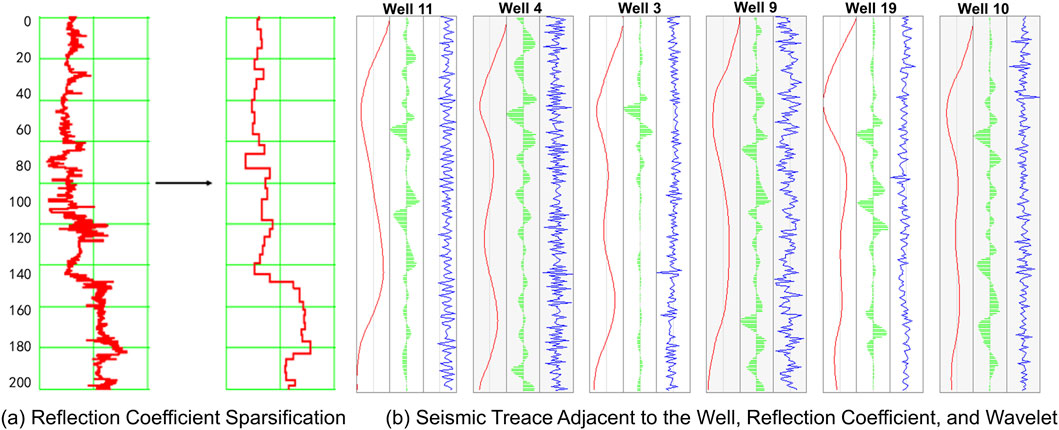 Figure 10. Sparsification effect on reflection coefficient. (a) Shows the reflection coefficient sparsification. (b) illustrates the seismic trace adjacent to the well, reflection coefficient, and wavelet of five wells. The distribution of wells is shown in Figure 3.