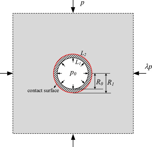The selection of interaction models for rock-lining interfaces significantly influences structural calculations. Although analytical and numerical methods are extensively employed in tunnel engineering (Timoshenko and Goodier, 2007), three persistent limitations hinder practical applications: the complexity of contact due to material heterogeneity at the lining-rock interfaces, the computational inefficiency of deriving rapid analytical solutions, and insufficient quantification of parameter sensitivity (e.g., relative lining stiffness E2/E1, thickness d/R0, lateral pressure coefficient λ, and displacement release coefficient η). These gaps are particularly pronounced for frictional sliding contact conditions where mature methodologies remain underdeveloped.