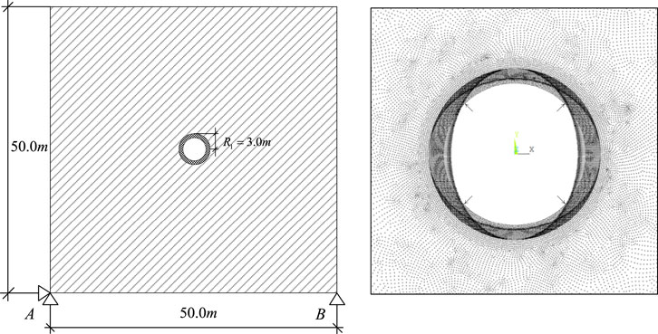 The boundary conditions and load application schemes of the simulation examples in ANSYS are shown in Figure 4. The external boundary of the selected model measures 50.0 m × 50.0 m, with an excavated tunnel radius of 3.0 m. Point constraints are applied at location A in both the horizontal and vertical directions, while only vertical constraint is imposed at point B. A surface load of 2.0 MPa is applied to the lining’s inner boundary, and the calculated equivalent nodal loads are applied to nodes on the contact surface.