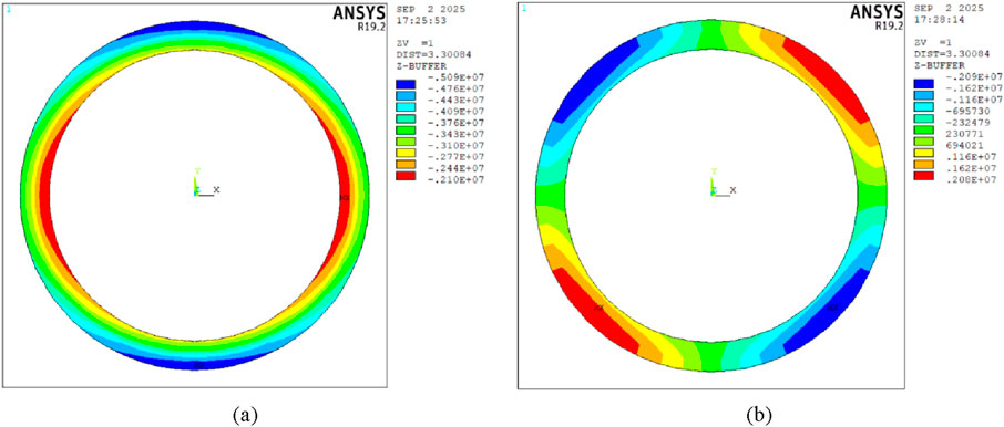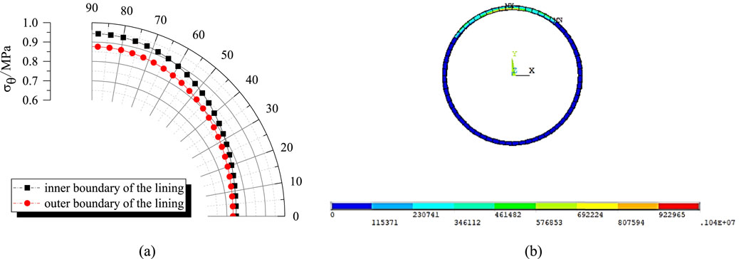 Both computational methods identify the vault inner edge as the critical tensile stress concentration zone. The analytical solution (Figure 13a) demonstrates progressive tensile stress increases from haunch (0 °) to crown (90 °), reaching peak values of 0.941 MPa at the inner edge and 0.875 MPa at the outer edge. In contrast, the numerical solution exhibits analogous distribution patterns but yields 9.51% higher peak tension (1.04 MPa), calculated as Δσt = ∣1.04–0.941∣/0.941% × 100%. This discrepancy arises because the numerical model assumes perfect bonding, neglecting interfacial slip that reduces tensile stress in the analytical formulation. This mechanism is corroborated by principal stress contours in Figure 14b showing elevated tension at the bonded crown. Analysis of thickness effects (Figure 14) further reveals that increasing lining thickness from 0.4 m to 0.8 m decreases crown tensile stress by 15% in analytical results, while haunch compressive stress variations remain below 8%.