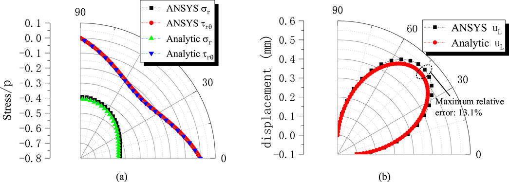 Figure 5 shows the Tangential stress and shear stress distribution contour plot of the lining. Within the range of [0 °–90 °], the tangential stress gradually decreases, while the shear stress reaches its maximum value at 45 °. Figure 6 presents a comparison between the numerical and analytical solutions. Due to symmetry, the results within the range of [0 °–90 °] are compared. At the rock-lining interface, contact stresses obtained by both methods show close agreement, with the maximum relative error of approximately 3.84% occurring at the crown. This minor deviation is attributed to the full compliance with contact conditions at boundaries, demonstrating the superiority of this contact model over traditional “load-structure” approaches. Displacement comparisons reveal a maximum relative error of 13.1% at the crown, further confirming model consistency.