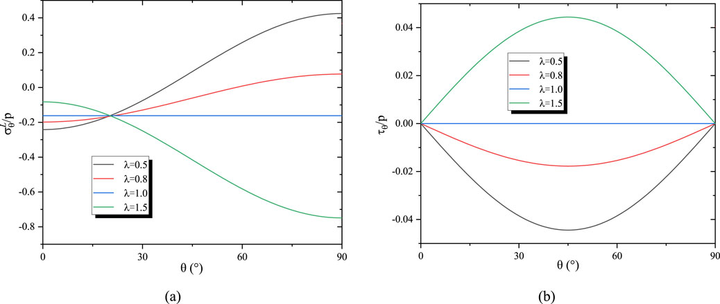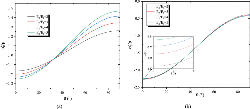 Figure 7. The influence of the modulus ratio on stress distribution. (a) Tangential stress on the inner boundary of the lining for different