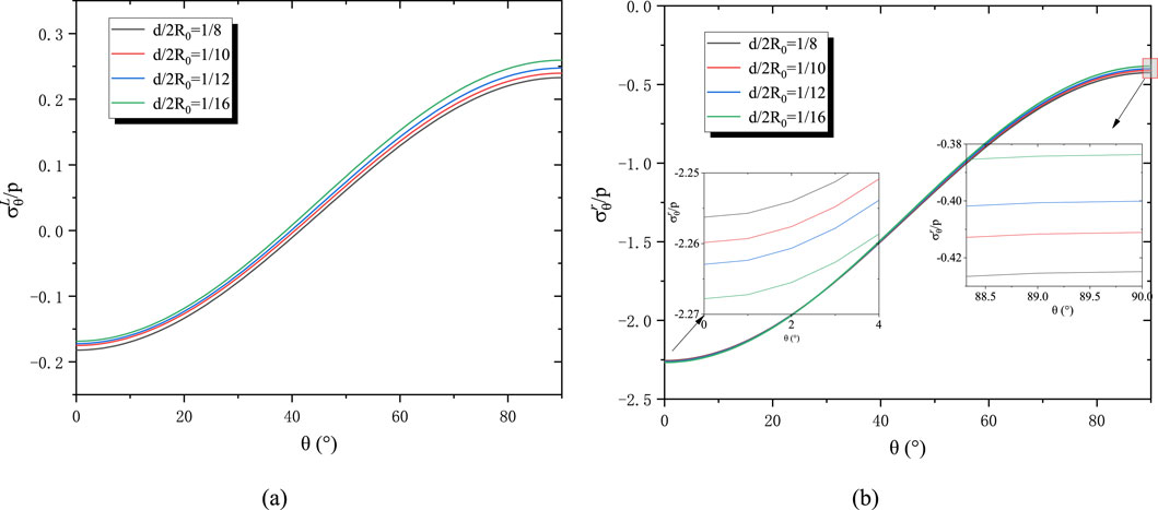 The effect of relative lining thickness is then investigated while maintaining constant tunnel internal diameter. Ratios of d/2R0 = 1/8, 1/10, 1/12, and 1/16 are considered. Figure 8a demonstrates that lining thickness has lesser influence than modulus ratio. Compressive stress near the haunch decreases while tensile stress near the crown increases as the lining thins: when thickness is halved, haunch compressive stress reduces by approximately 7.4%, and crown tensile stress increases by 11.4%. Figure 8b confirms compressive stress throughout the surrounding rock, with the range of variation expanding as lining thickness decreases. Collectively, lining stress is more sensitive to elastic modulus and thickness variations than surrounding rock stress, with crown regions exhibiting greater susceptibility than haunch locations.