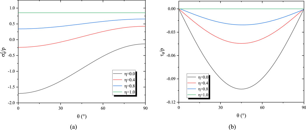 As shown in Figure 9, variations in the lateral pressure coefficient (λ = 0.5, 0.8, 1.0, 1.5) lead to significant changes in both tangential and shear stresses. When λ = 1, meaning the horizontal and vertical stresses are equal, both the tangential stress and shear stress remain constant. For smaller values of λ (<0.8), the tangential stress reaches its minimum at the 0° haunch position and its maximum at the 90° crown. Conversely, for larger values of λ, the distribution pattern is reversed, with the minimum tangential stress occurring at the 90° crown. The shear stress attains its extremum at 45 °, and as λ gradually increases, the shear stress shifts from negative to positive. When λ = 1, there is no shear stress on the contact surface, and no relative sliding occurs. Figure 10 illustrates the stress distribution patterns as the displacement release coefficient varies. Similarly, the stress distribution is highly sensitive to changes in the displacement release coefficient. When η = 0, the entire excavation-induced displacement of the surrounding rock is borne by the lining; at this point, both the tangential and shear stresses reach their maximum values. The maximum tangential stress occurs at the 0° haunch position, while the maximum shear stress remains at the 45° position. As η increases, the distribution of tangential stress becomes more uniform, resulting in a more even load on the lining, and the magnitude of the shear stress gradually decreases. When η = 1, indicating that the excavation-induced displacement of the surrounding rock is fully released, the pressure acting on the lining drops to zero, the shear stress at the interface becomes zero, and the lining is subjected only to internal water pressure, thereby exhibiting a tensile state.