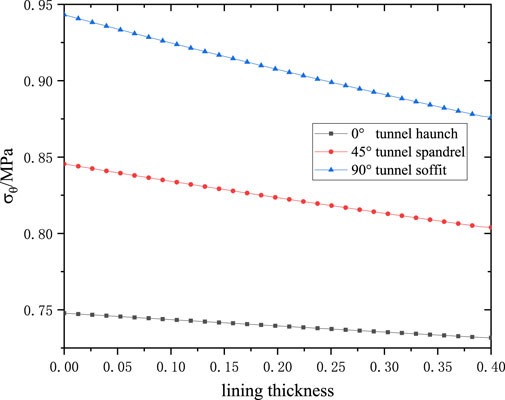 The effects of relative lining thickness and material stiffness on lining and rock stresses are systematically analyzed. Given the significant support delay typical in hydraulic tunnel construction, a displacement release coefficient of η = 0.8 is adopted. All parameters except those under investigation remain unchanged, with analysis focused on the [0 °–90 °] range and engineering-critical tangential stresses.