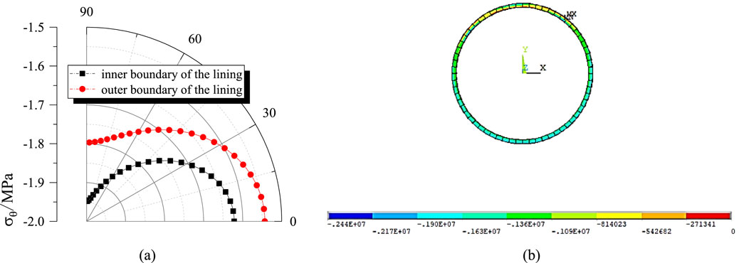 Figure 13. Tangential stress variation and major principal stress contour plot of the lining under operational condition. (a) Tangential stress by analytical method; (b) Major principal stress by numerical method.