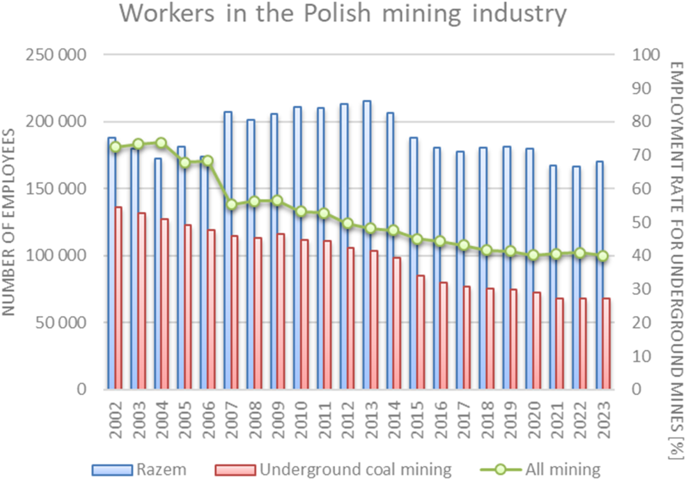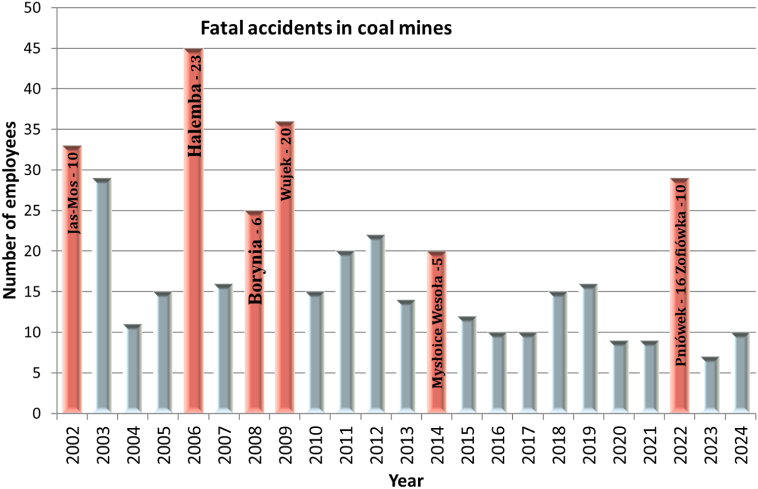 Work-related incidents are typically classified into injurious and non-injurious events. Among injurious incidents, occupational accidents are distinguished, whereas non-injurious events include near-miss incidents or potentially hazardous situations. Employers are obligated to systematically investigate the causes of workplace accidents and, based on the results of these analyses, implement appropriate preventive measures and safety interventions. In the context of hard coal mining, the predominant cause of accidents is the so-called “human factor,” which accounts for approximately 80% of incidents (Kapusta et al., 2024). Accident analysis serves not only as a tool for reporting the number and consequences of accidents, but more importantly, as a basis for implementing corrective and preventive actions aimed at reducing and eliminating accident causes. To benchmark safety performance across enterprises, accident frequency and severity rates are commonly used. However, the key element remains the development of appropriate worker attitudes and behaviors, often described in the literature as a “safety culture” (Kapusta et al., 2020). In 2023, there were a total of 2,205 occupational accidents in the Polish mining industry, of which 1,907 occurred in hard coal mines. Over the past 22 years, the total number of accidents has decreased by only one-third, despite the closure of more than half of the underground mines. Notably, in 2023, nearly 9 out of 10 accidents (86.3%) occurred in hard coal mines, compared to 3 out of 4 (75.7%) in 2002. Over the same period, hard coal production declined by more than 50%, from over 100 million tonnes in 2002 to 47.5 million tonnes in 2023. Total employment in the mining sector has remained relatively stable at approximately 170,000 employees over the last two decades. However, a clear downward trend can be observed in employment specifically within the hard coal mining segment (Kraszewska et al., 2022). In 2002, more than 70% of the mining workforce was employed in hard coal mines, whereas by 2023 this share had dropped to just 40%.