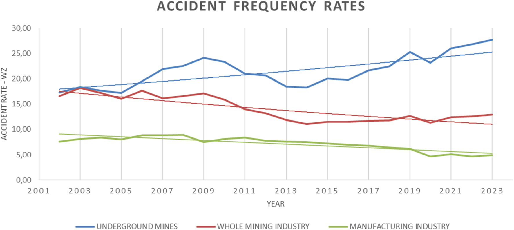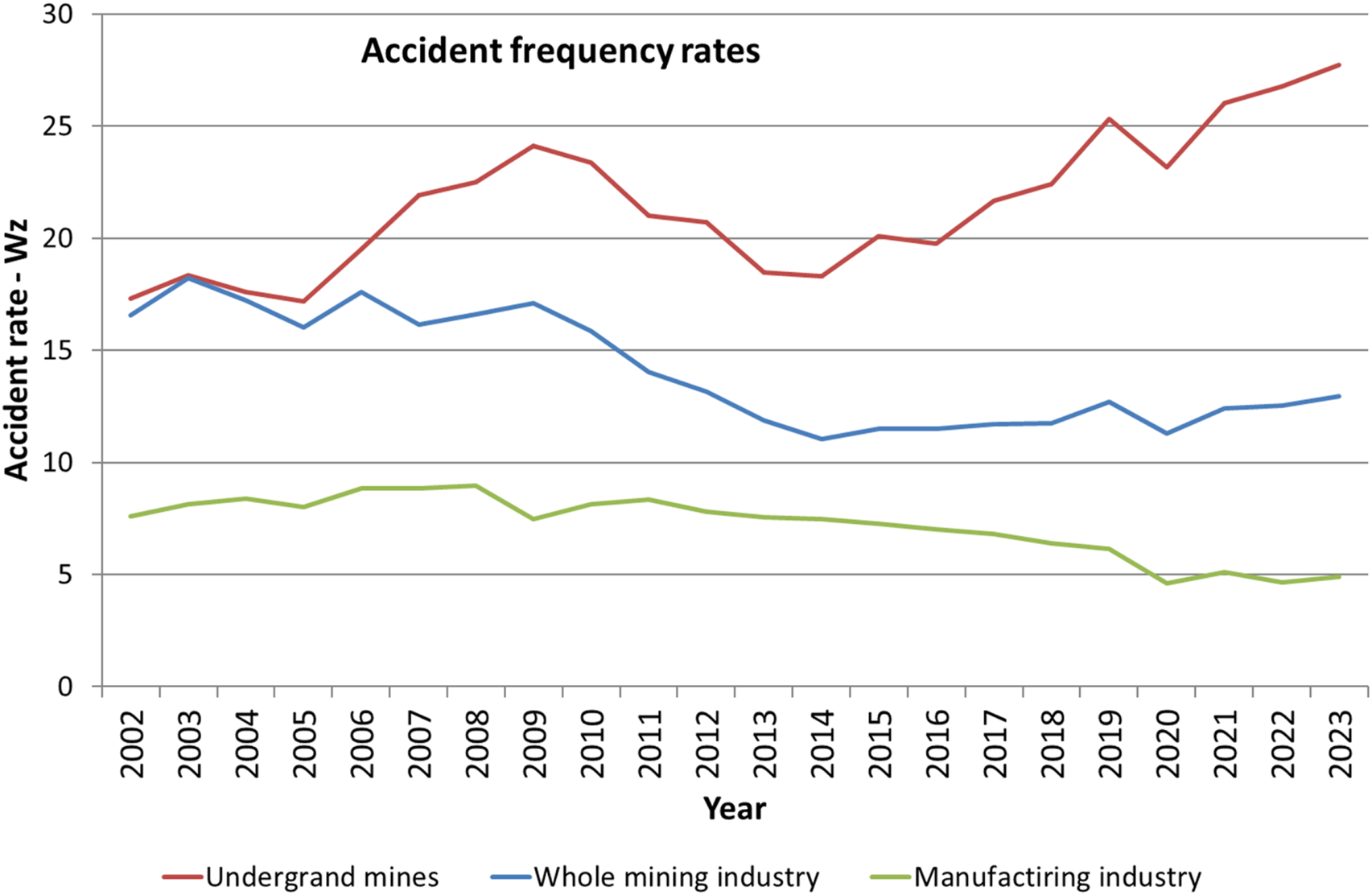 The article concerns one of the most important issues related to occupational safety in Polish hard coal mines. In general, the issue of safety is related to the occurrence of two groups of factors in the extraction process: geological-mining and technical-organizational. Both of these groups cause a number of hazards. Hazards related to the exploitation of minerals from the underground have accompanied miners since the beginning of mining. In the Polish mining industry, over the last 22 years, it can be observed that the number of accidents has decreased by only 1/3. At the same time, the accident frequency index (Wz) increased from 17.31 in 2002 to 27.71 in 2023. Accident monitoring and indicator analysis are key to improving occupational safety conditions and preventing future accidents. The probability of an accident at work in mines is several times higher than the average value obtained for all positions in the economy, especially in Poland, where hard coal is extracted using the underground method. The article presents accident statistics in hard coal mining in Poland since 2002, calculates accident rates, and approximates the accident rate trend for subsequent years. The factors that determine accidents in Polish mines to the greatest extent were also analyzed. The division and mishaps of catastrophes, which unfortunately still occur in the Polish mining industry, were also discussed.
