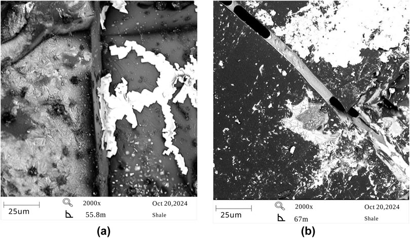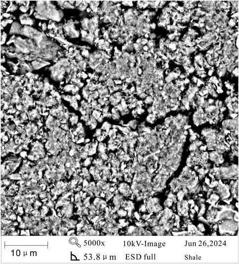 The surface morphology of the polymer-treated shale samples was characterized using scanning electron microscopy (SEM) at 2000 times magnification. Multiple representative areas were examined to ensure comprehensive coverage and statistical reliability.