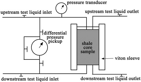 Pressure transmission testing replicates the pressure differential between the wellbore and formation by applying pressure across the shale sample. While maintaining constant upstream pressure, sensors monitor dynamic pressure changes in the sealed fluids at both ends. Figure 2 illustrates the experimental setup: the shale sample is placed between two porous screens inside a Viton sleeve that applies radial confining stress. The hollow piston connects to a downstream reservoir equipped with a pressure sensor.