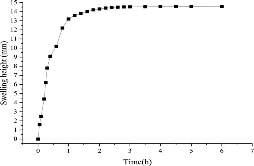 The average linear swelling of the samples was 14.4 mm, indicating that the shale cores have strong hydration swelling characteristics (Figure 3). The samples swelled rapidly upon initial contact with water, with the swelling rate slowing after 30 min until stabilizing within 6 h. This behavior is mainly due to the high clay mineral content in the shale, which causes moderate water sensitivity.