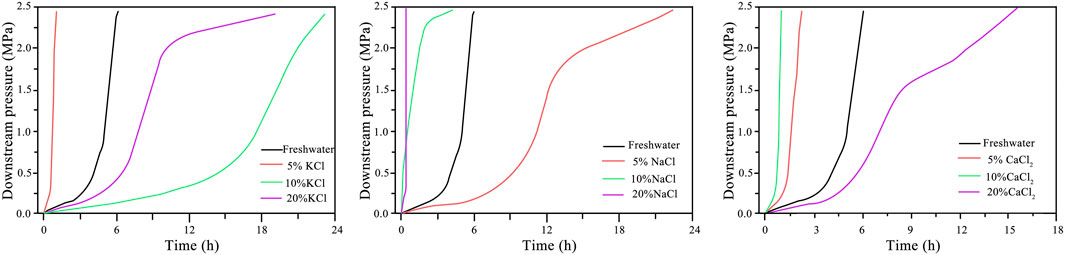With the HKY-3 shale pressure transmission device, the pressure transmission behavior of different solutions in contact with the Yanchang shale was investigated. The confining pressure was set at 2.3 MPa, the upstream pressure at 1.5 MPa, and the downstream pressure at zero.
