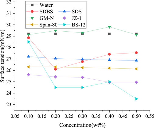 To modify the wettability of shale surfaces, six water-soluble surfactants, were selected for this study: anionic (sodium lauryl sulfate (SDS), sodium dodecyl benzene sulfonate (SDBS)), cationic (quaternary ammonium salts (GM-N, JZ-1)), amphoteric (dodecyl dimethyl betaine (BS-12)) and nonionic (Span80). These surfactants are used as water-locking agents in shale gas reservoir fluids due to their ability to transform the hydrophobic shale surface into a strongly hydrophilic one (Figure 9).