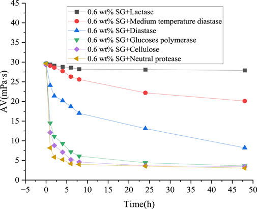 To obtain polymer degradants for effective degradation, six enzymes were added to the prepared polymer solution (0.6 wt% SG) at a concentration of 0.2 wt‰ and thoroughly mixed. The viscosity changes were measured after 1, 2, 4, 6, 8, 24 and 48 h of standing, as presented in Figure 10.