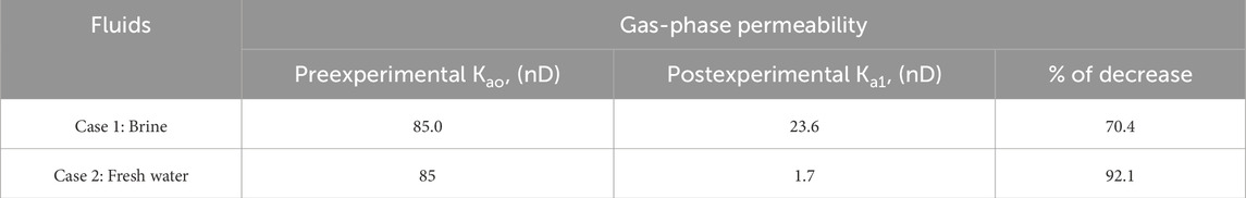 To illustrate the damage caused by water intrusion in shale reservoirs, the shale permeabilities before and after freshwater and saltwater circulation were compared. Table 2 shows that the gas phase permeability of the shale immersed in brine decreased by 70.4%, whereas exposure to circulating freshwater at the core’s end and reduced gas-phase permeability by 92.1%. This indicates that water intrusion is the primary cause of damage to the Chang 7 member of the Yangchang shale reservoir.