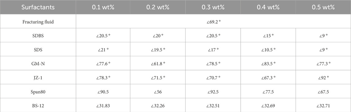 To reduce reservoir damage induced by water blocking during fracturing, enhancing the hydrophobicity of fracturing fluids is critical. Table 3 presents the contact angles of various surfactant-treated fracturing fluids on shale surfaces. As the concentration of anionic surfactants SDBS and SDS increased from 0.1 wt% to 0.5 wt%, the contact angles decreased from 20.5 ° to 9 ° and from 21 ° to 9 °, respectively, indicating enhanced hydrophilicity that hinders water block issues. In contrast, cationic surfactants GM-N and JZ-1 maintained high contact angles at various concentrations (e.g., GM-N reached 83.5 ° at 0.4 wt%, and JZ-1 reached 92 ° at 0.5 wt%), demonstrating strong hydrophobicity characteristics and effective wettability alteration.