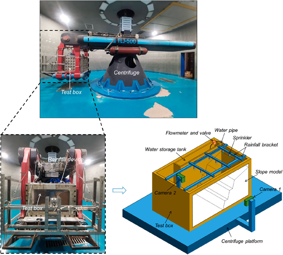 A rigid test box with internal dimensions of 1,200 mm (length) × 1,000 mm (width) × 800 mm (height) was used to construct the slope model. One side of the box was made of transparent Plexiglass, allowing for real-time observation of soil deformation, water infiltration, and failure process during the test. The box was securely mounted inside the centrifuge to ensure stability under high centrifugal forces. Figure 1 illustrates the rainfall system configuration and test box arrangement within the centrifuge.